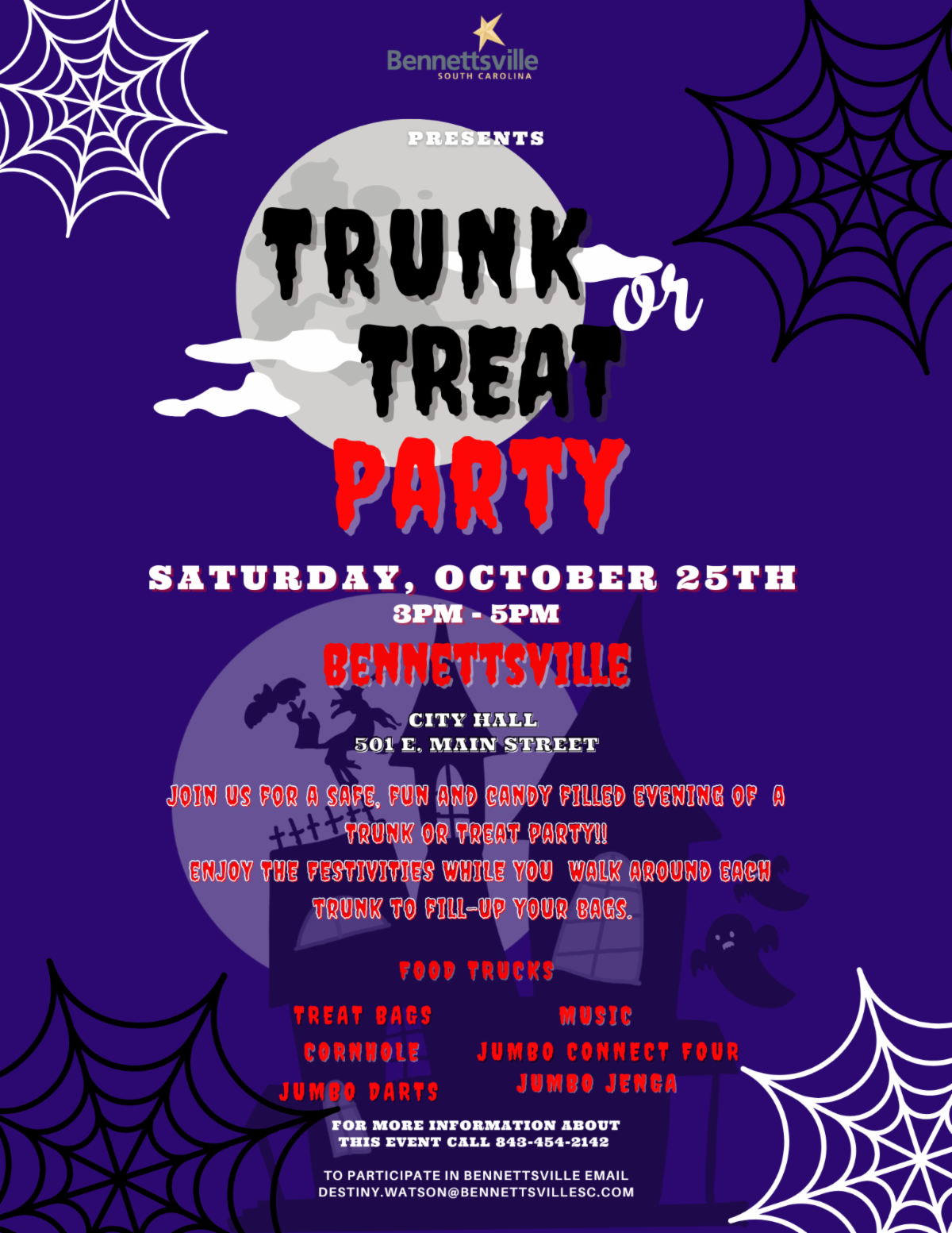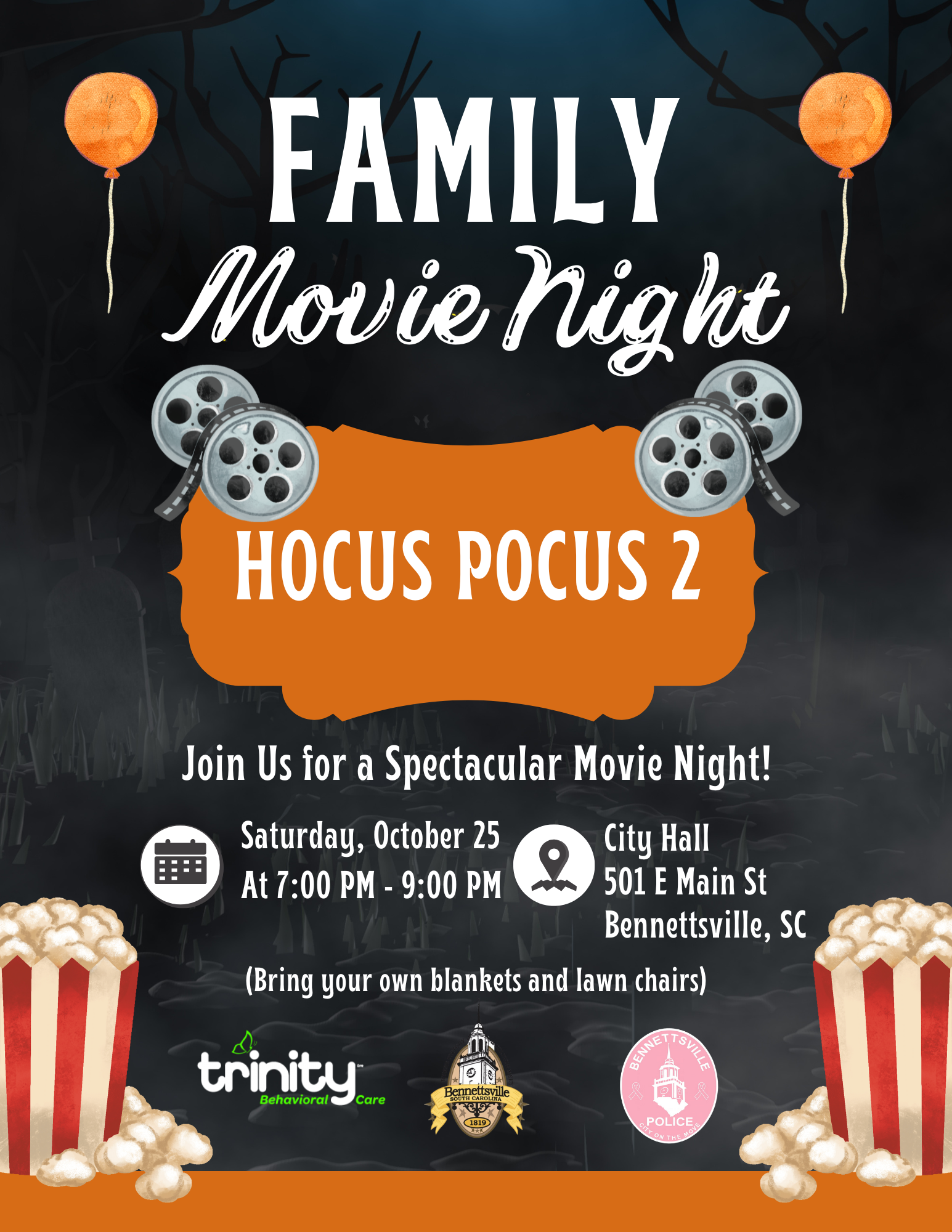 Schedule of Events and Treatment « All EventsFamily Movie NightOctober 25 @ 7:00 am - 9:00 pm« Board MeetingJoin us Saturday, October 25, 2025 for a spook-tacular evening! Trunk or Treat starts at 3 PM -5 PM Family Movie Night begins right after at 7 PM. Bring your blankets, lawn chairs, and your favorite people!Location: City Hall, 501 E Main St, Bennettsville, SCCome dressed in costume, grab some candy, and stay for a family-friendly movie under the stars! FREE ENTRY | All ages welcome Add to calendar Google Calendar iCalendar Outlook 365 Outlook Live Details Date: October 25 Time: 7:00 am - 9:00 pm Venue 501 E Main St, Bennettsville, SCHigh School Video ContestTopicsAddiction ADSAP Alcohol Confidentiality Counseling Drugs Help Marijuana Privacy Teens Trauma TreatmentMore InfoEventsLife QuestionsPartner SignupContact Privacy and Confidentiality Statement View our job board at Indeed.com © 2025 Trinity Behavioral Care · Site by Catoe Group